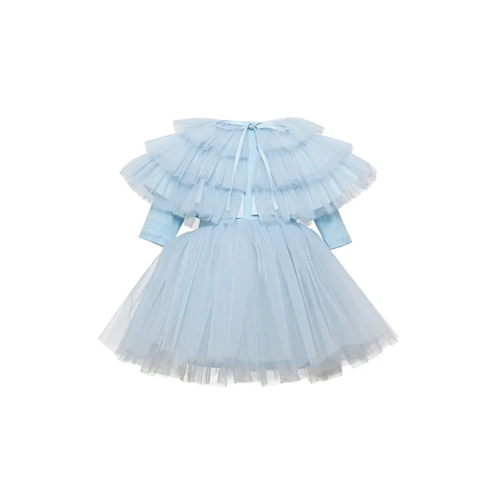 Boat neckline, elbow sleeves, blue tulle skirt dress. Cloak with ruffle detail. The dress is made of cotton fabric, the inner lining of the cape is also cotton.