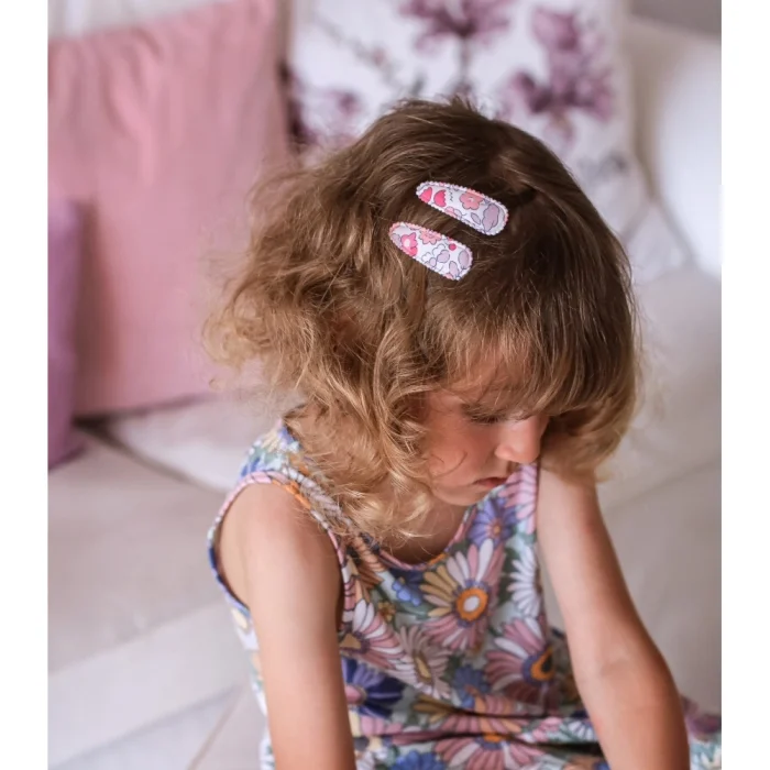 "Mini Clip Buckles Product Description: Mini Clips, with its great design and stylish colors of Liberty London patterns, combined with sparkling glitter details, make it the perfect hair accessory for little girls. Material: Premium fabric (Liberty London pattern) Size: 5.5 cm Colors: Pattern placement may vary."