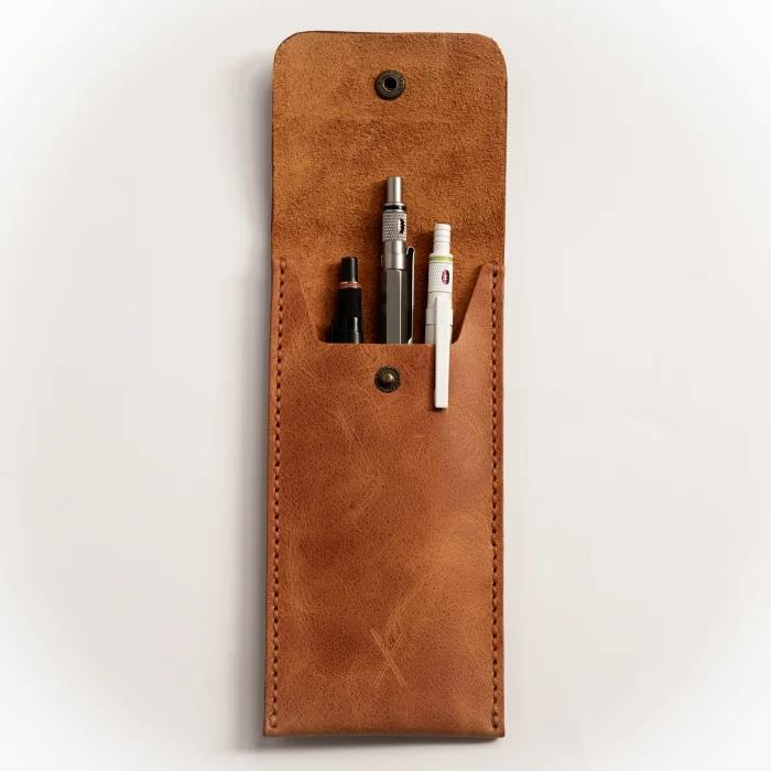 minimal X Leather Pen Holder Genuine leather, minimalist and stylishly designed pen holder 5 pen capacity, Clamshell design (snap fastener). Material: Genuine Calf Leather Closed Dimensions: 17 x 8 cm Leather Thickness: 1.3 - 1.4 mm Product Weight: 40 Grams Minimalist and Stylish Design. It is real leather and handmade. Our products are sent as a standard gift package. NOTE: Since it is real leather, there may be slight color tone differences. NOTE2: Products and pens other than the Leather Pen Holder are not included in the use of visual decoration purposes.