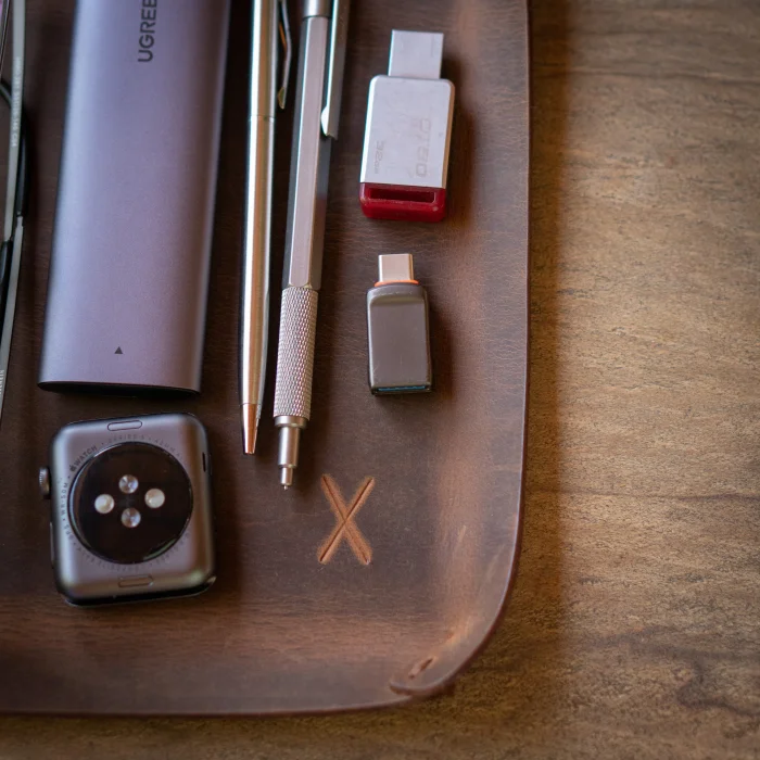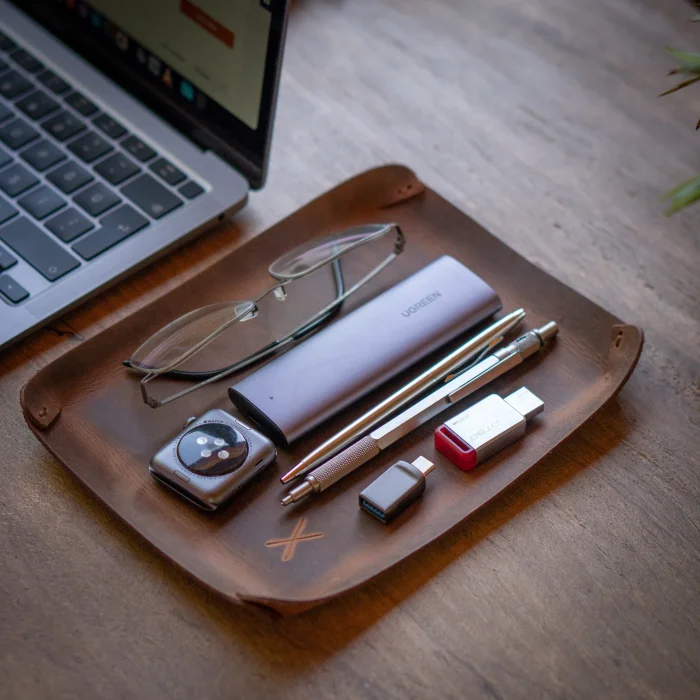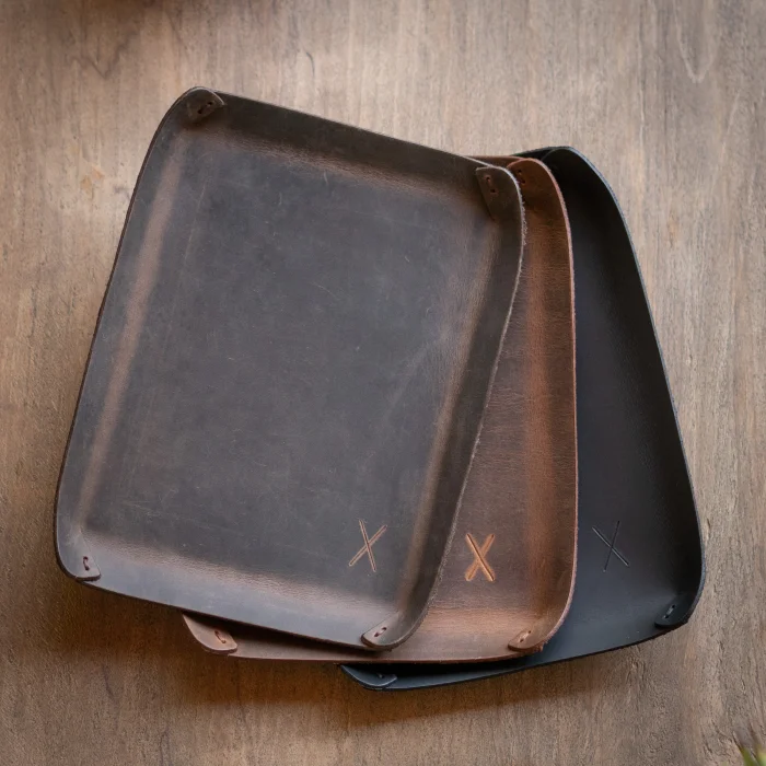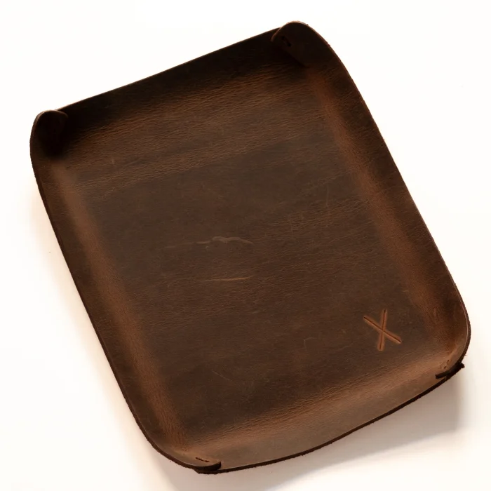 minimal X Desktop Leather Tray Material: Genuine Calf Leather (Crazy) Leather thickness: 1.8 mm Product Dimensions: 16 x 12 cm (Small Tray), 21 x 16 cm (Large Tray) Product Weight: 25 grams (Small Tray), 50 grams (Large Tray) Minimalist and Stylish Design. It is real leather and handmade. Our products are sent as a standard gift package. NOTE: Since it is real leather, there may be slight color tone differences. NOTE2: Products other than Leather Keychain are not included as used for visual décor purposes.