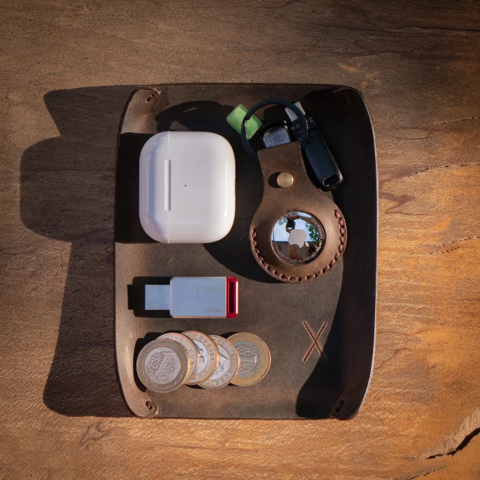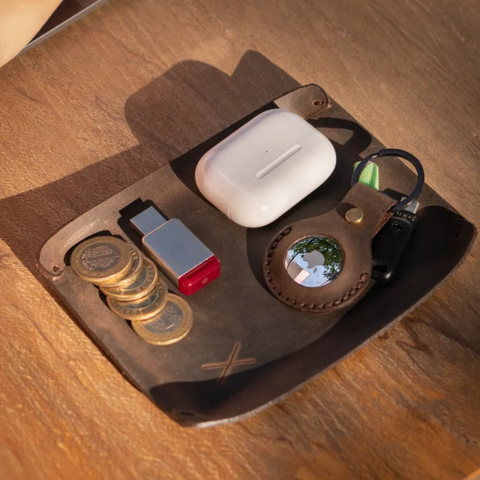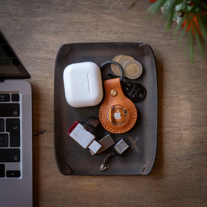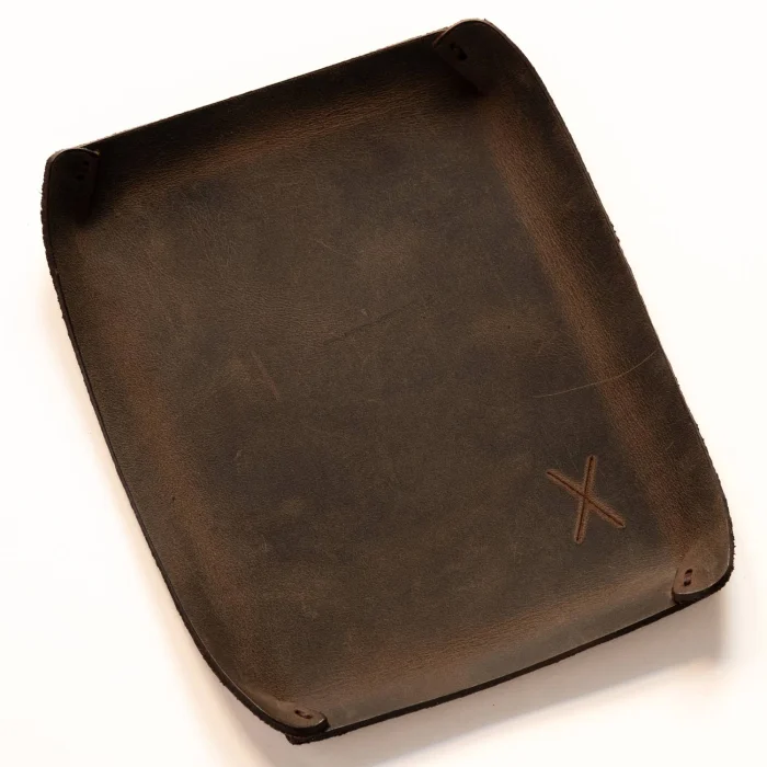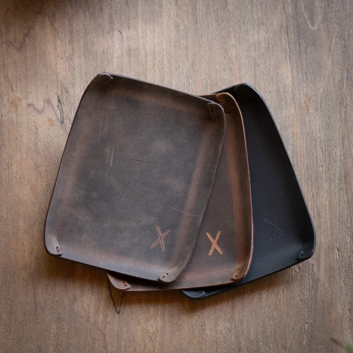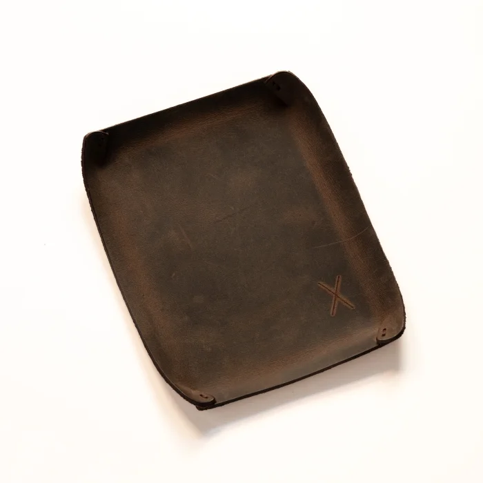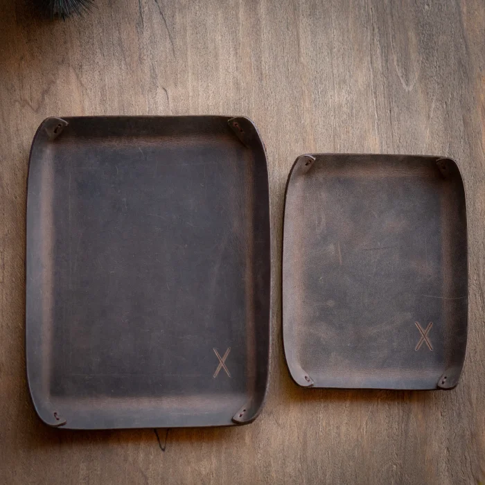 minimal X Desktop Leather Tray Material: Genuine Calf Leather (Crazy) Leather thickness: 1.8 mm Product Dimensions: 16 x 12 cm (Small Tray), 21 x 16 cm (Large Tray) Product Weight: 25 grams (Small Tray), 50 grams (Large Tray) Minimalist and Stylish Design. It is real leather and handmade. Our products are sent as a standard gift package. NOTE: Since it is real leather, there may be slight color tone differences. NOTE2: Products other than Leather Keychain are not included as used for visual décor purposes.