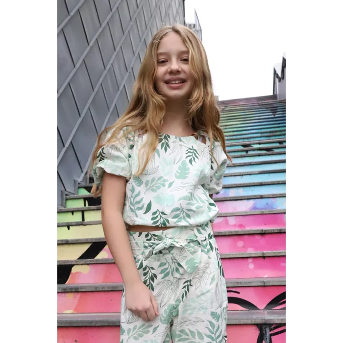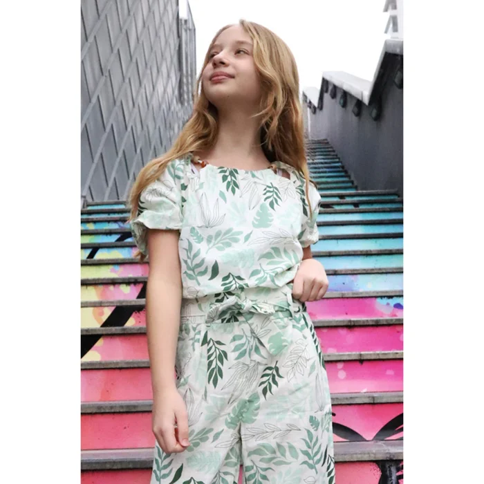 Darpes Green Leaf Patterned Cotton Girls' Blouse is specially designed for girls between the ages of 7-12. It draws attention with its rounded neckline, bead details on the collar edges, balloon sleeves and hems, and lined blouse design. The fabric of the blouse is made from 100% Better Cotton. Better Cotton is a programme developed for more sustainable cotton production, which provides better conditions for both the environment and cotton growers. The choice of ecru color offers a warm and natural look. This color allows your child to easily combine with different underwear and can be worn in all seasons. The all over print print with a green leaf pattern adds a natural and energetic feel to the blouse. This pattern emphasizes your child's connection to nature outside and reflects youthful energy. With its balloon sleeve and hem-end design, the blouse offers a lively and feminine style. In addition, its lined structure allows the blouse to have a fuller and higher quality look.