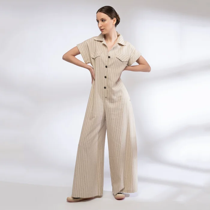 LOW SLEEVE, SHIRT COLLAR BUTTONED LOOSE FIT JUMPSUIT