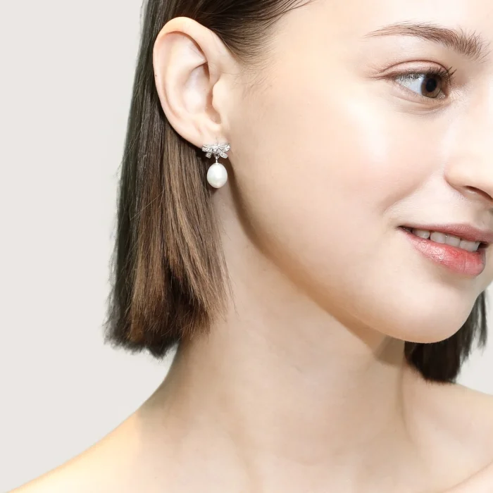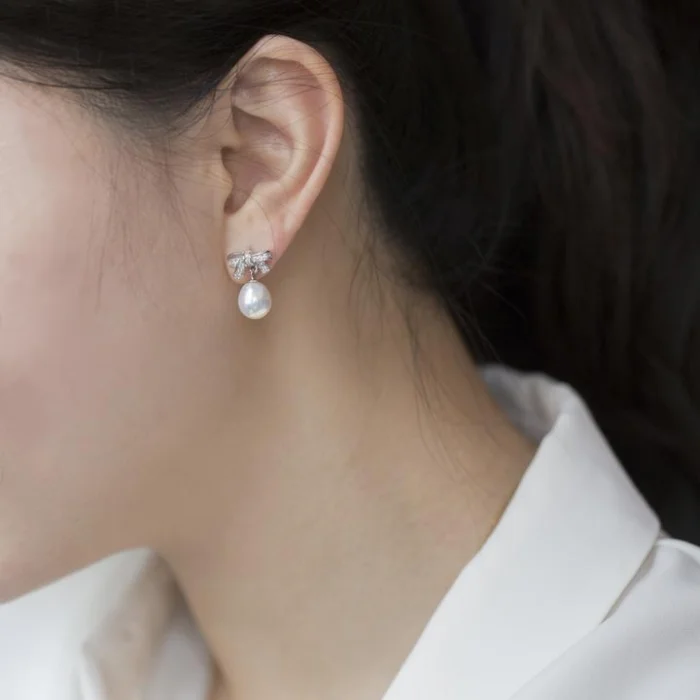 Rhodium plated on 925 Sterling Silver, which is resistant to tarnishing. Natural Freshwater Pearl