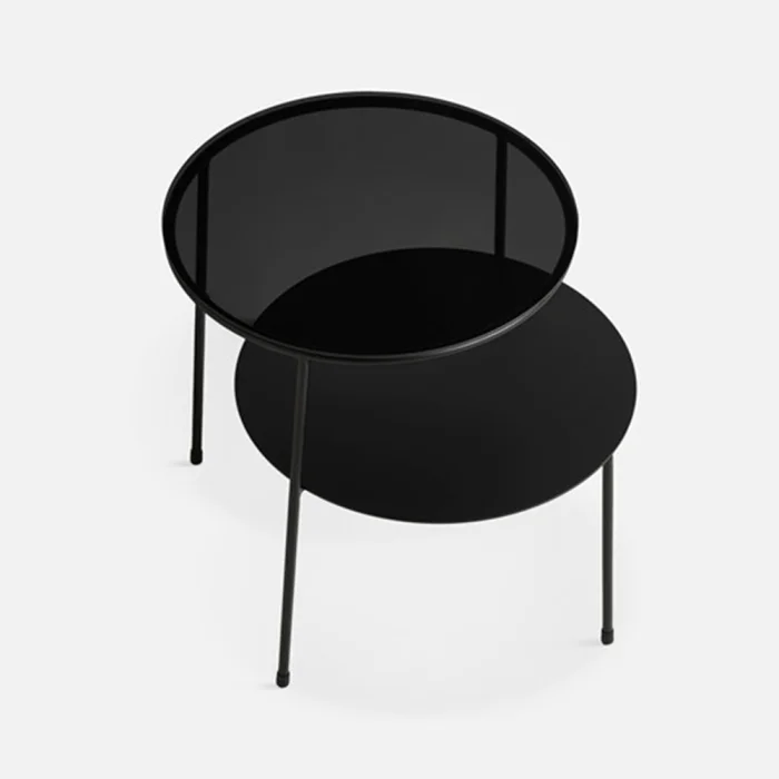 The lower table is sheet metal material and the upper table is 6mm thick smoked glass. Metal Parts are painted with electrostatic powder paint.