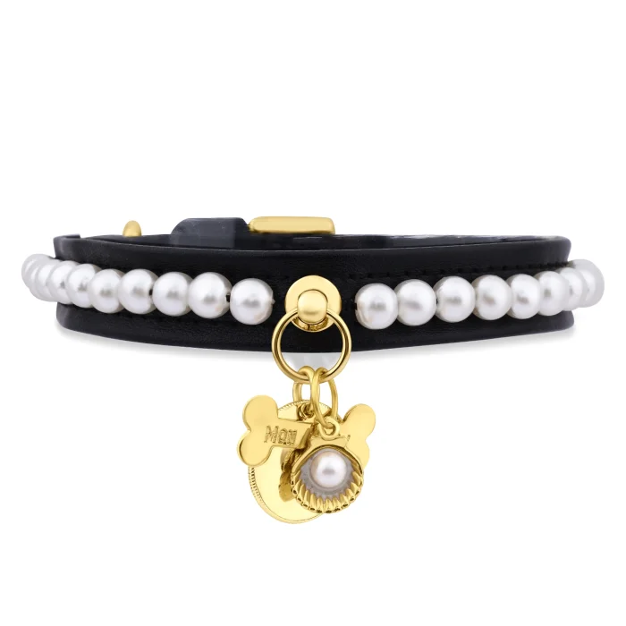 Vegan-friendly glitter and elegantly embellished with shimmering pearl grains on matte leather. This collar will be a unique accessory to complement your dog's style on special occasions while also providing a great option for everyday wear. You can complete your dog's look with a walking strap that includes pearl and gold-plated mini hearts on vegan-friendly leather of the same color.