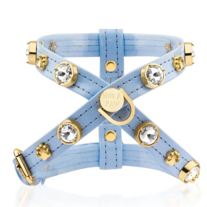 is elegantly embellished with sheer colored Swarovski crystals and gold-plated tiny paws that shimmer on shiny baby blue, vegan-friendly glitter leather. This Harness will be a unique accessory to complement your dog's style on special occasions while providing a great option for everyday wear. You can complete your dog's look with a walking strap adorned with swarovski crystals of the same color.