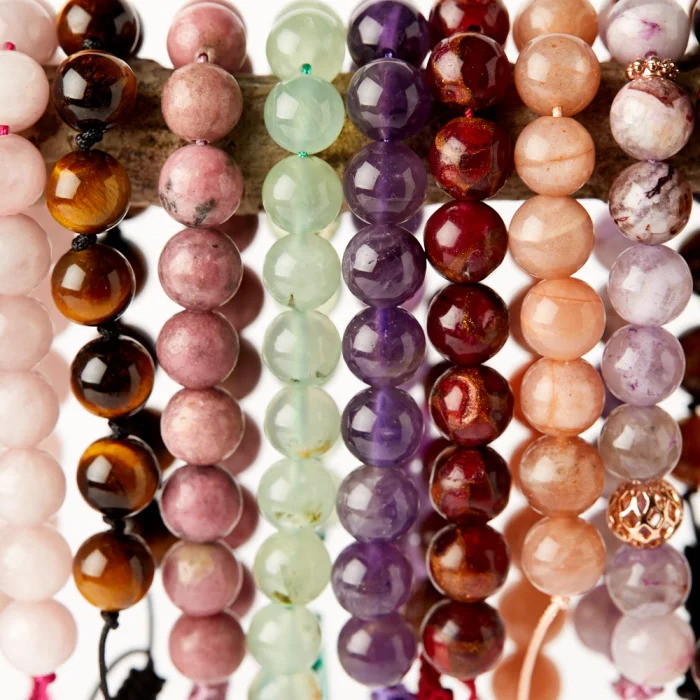 Our beautiful bracelet is meticulously hand-crafted with 18 Prehnite stone beads on a green rope, with an adjustable accordion knot for the wrist. The metal tiny complements on the accordion end are gold-plated brass materials.