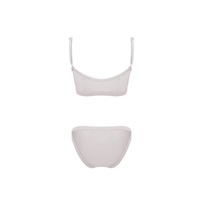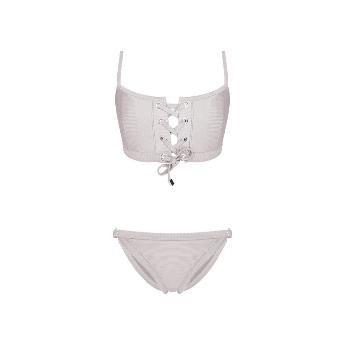 Structured corset with fused binding of textured ribbed fabric. Lace up front with light gold eyelets, featured with adjustable thin straps. Smooth stretch lining for extra comfort. Binded bikini bottom with adjustable side tabs.