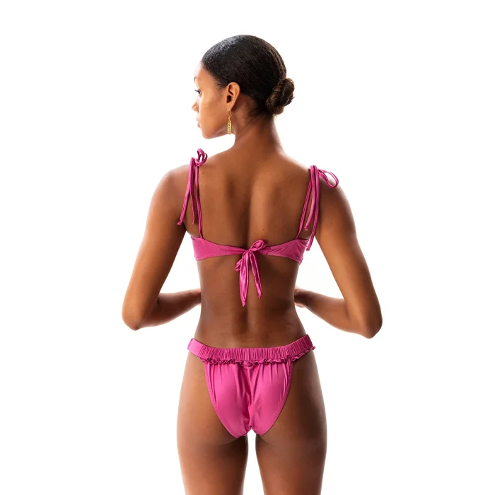 •Bandeau style frill bikini. •Adjustable shoulder straps. •Ties on back for a perfect fit. •Ruched wide banded bikini bottom. •High leg cut. •Shiny + light-weighted soft fabric. •Smooth stretch lining for extra comfort. •Removable push up paddings.• The product size worn by the mannequin in the picture is size XS (34) • Model dimensions: 83/58/90 Height: 1.71