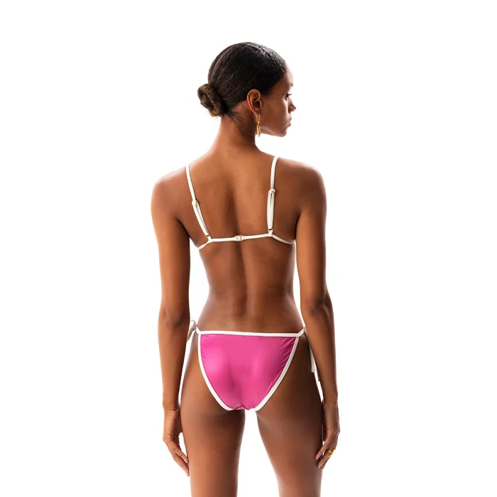 •Adjustable straps. •Ties on middle front. •String side tie bottom. •Contrast piping trim. •High leg cut. •Shiny + light-weighted soft fabric. •Smooth stretch lining for extra comfort. •Removable push up paddings.• The product size worn by the mannequin in the picture is S (36) • Model dimensions: 88/63/93 Height: 1.80