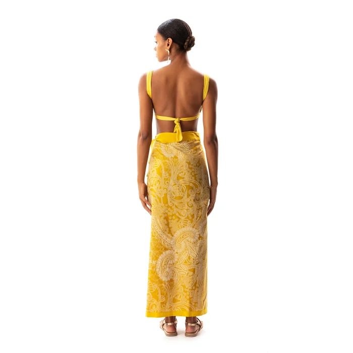 •Wrap-around mid length skirt. •With the self-tie fastening belt this garment can be worn multiple ways. •Like a full coverage skirt or a leg revealing pareo or even can be worn as a dress. •Soft silky vegan fabric. • The product size worn by the mannequin in the picture is size S. • Model dimensions: 83/58/94