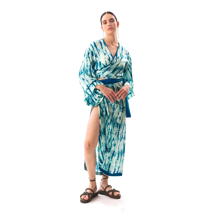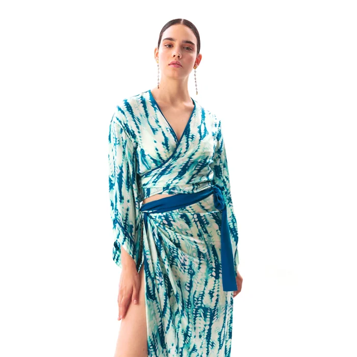 •Tie front style crop top. •Featuring wide sleeves. •Can be worn as envelope style by wrapping around on waist. •Soft silky vegan fabric. • The product size worn by the mannequin in the picture is XS-S • Model dimensions: 83/58/93