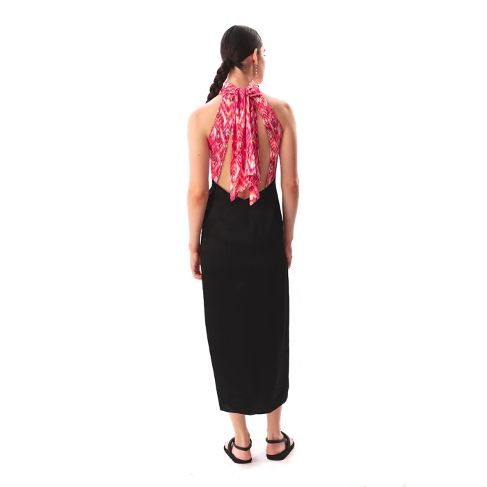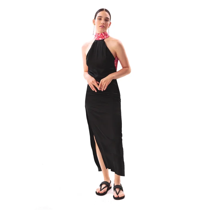 •Tie-neck gown. •Open back. •Adjustable bow at the neck •Side slit.. •Color blocked on neck and back. •Ankle length. •Soft silky cupro fabric. • The product size worn by the mannequin in the picture is size S. • Model dimensions: 83/58/94