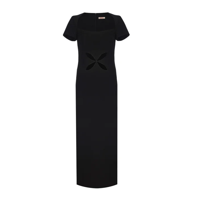 Satin crepe dress with Mox flower embroidery and back slit. Dry clean only. Model wears size 36. Model body measurements are 86-68-94. Since it is produced on order, it can be changed; but returns are not accepted.