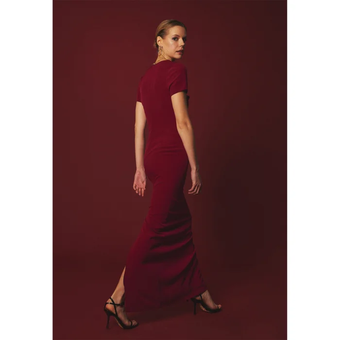 Satin crepe dress with Mox flower embroidery and back slit. Dry clean only. Model wears size 36. Model body measurements are 86-68-94. Since it is produced on order, it can be changed; but returns are not accepted.