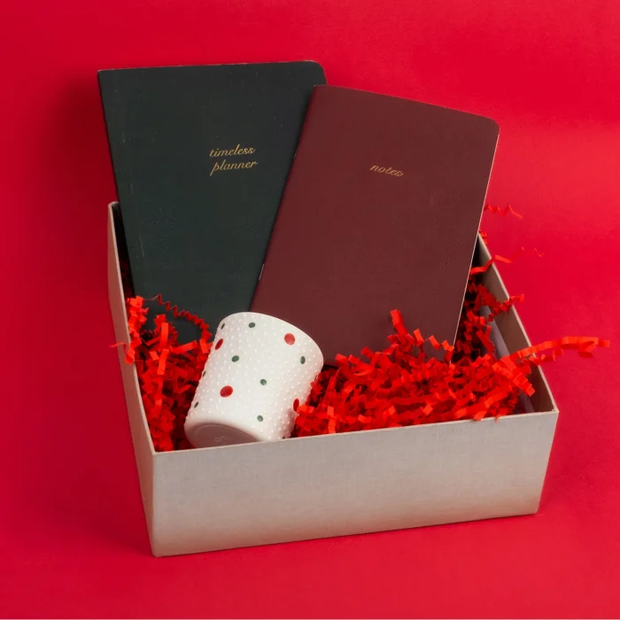The First Gift of the New Year: Special Christmas Boxes The New Year Is A Great Opportunity To Say Hello To Innovations And Fresh Beginnings! If you want to give a meaningful and stylish gift to your loved ones or colleagues this year, our specially designed Christmas boxes are just for you. Our boxes, which contain a stylish ceramic cup reflecting the spirit of Christmas, a thick Timeless Planner and a quality Notes notebook, offer a useful and aesthetic gift alternative. New Year's Themed Ceramic Cup: A stylish and durable glass where you can enjoy your hot drinks. You will feel the joy of the new year with every sip! One stylish Notes notebook: Inspirational and high-quality notebooks where you can record important moments in your life. You can write down your New Year's goals and shape your dreams. Mundo Timeless Planner: Use Your Time Efficiently, Achieve Your Goals! With its stylish and useful design, Mundo Timeless Planner allows you to easily make your daily, weekly and monthly plans. Organize Your Every Day With Quality Paper And Focus! Stylish and special packaging: Each box comes in carefully crafted, elegant Christmas-themed packaging. All that's left is to open your box and enjoy the new year! Add Elegance and Joy to 2025 with These Meaningful Gift Boxes That You Can Give To Your Loved Ones, Friends Or Colleagues. Order now and get your New Year's gift delivered to your door!