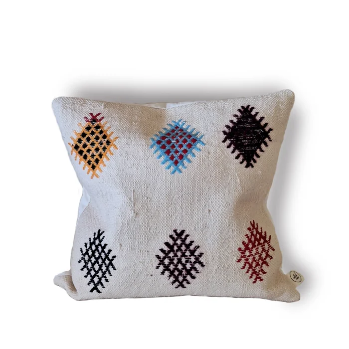 Color: Off white and multi color. Fibre: Hand woven vintage kilim & natural cotton backing with zipper.