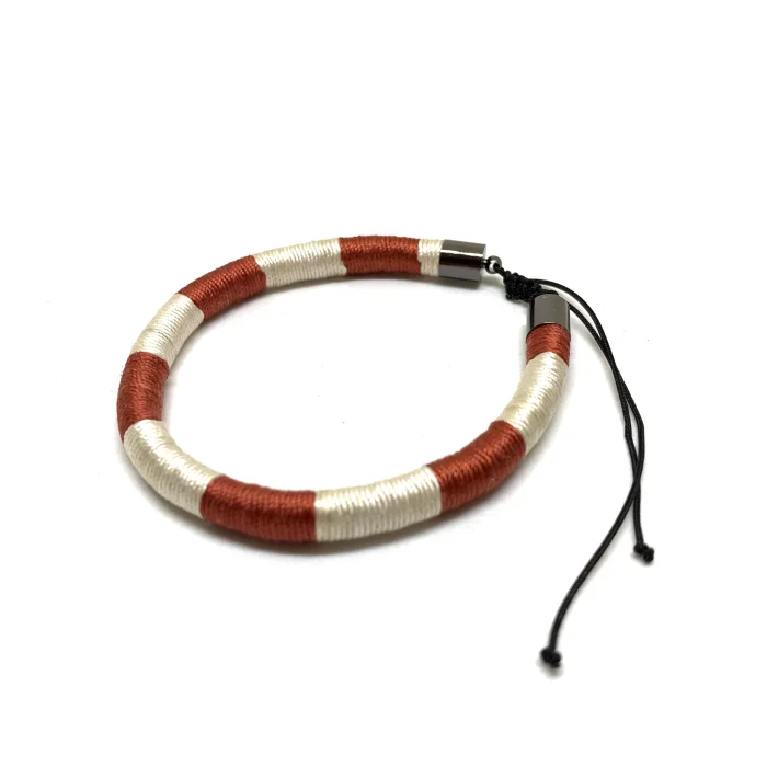 It is produced with silk threads dyed with natural dyes, cotton ropes and gold-plated brass accessories.