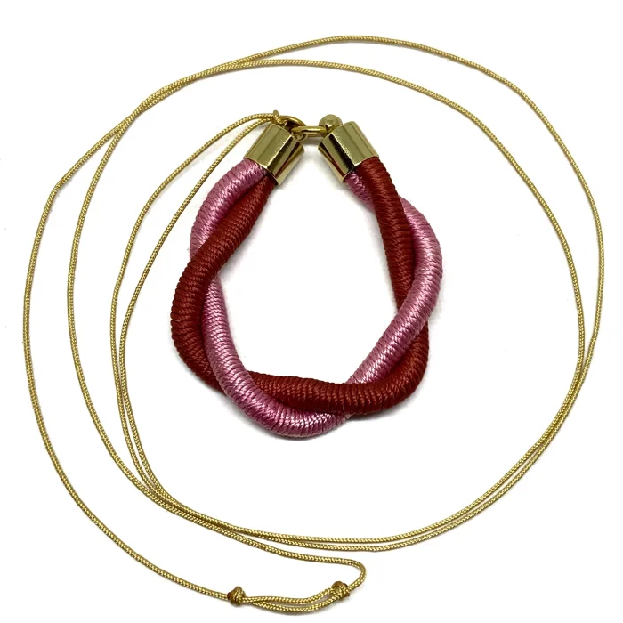 Silk threads dyed with natural dyes, cotton ropes, parachute rope and gold-plated brass accessories were used.