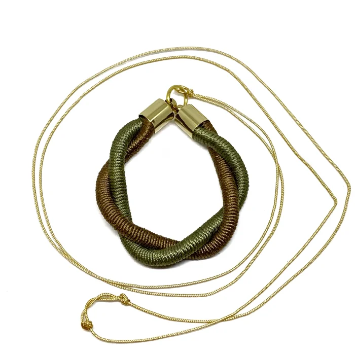 Silk threads dyed with natural dyes, cotton ropes, parachute rope and gold-plated brass accessories were used.