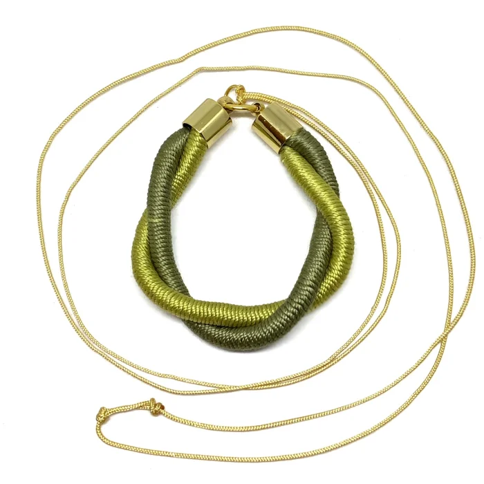 Silk threads dyed with natural dyes, cotton ropes, parachute rope and gold-plated brass accessories were used.