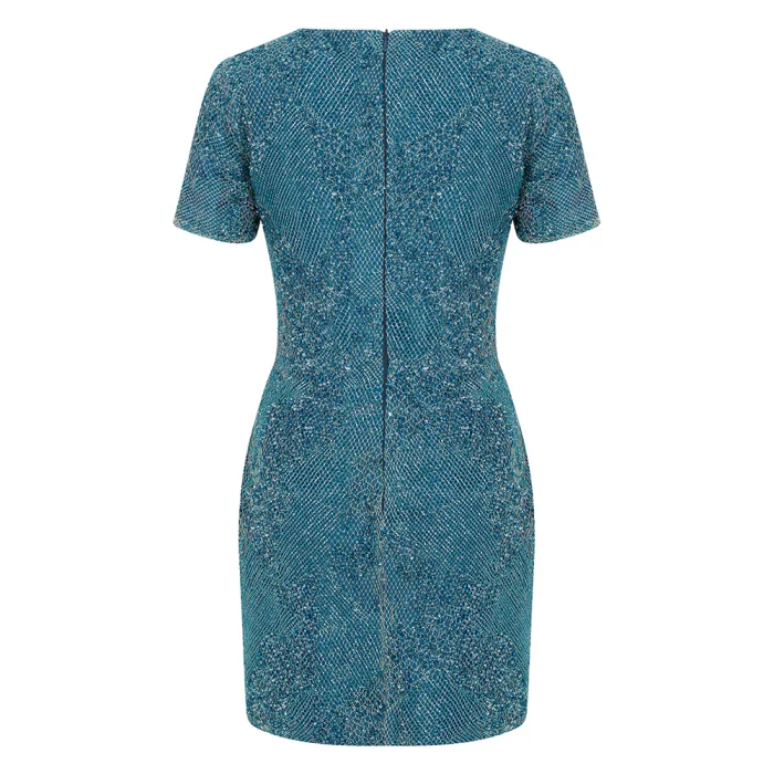 Product: Short Sleeve Imported Lace Beaded Mini Evening Dress