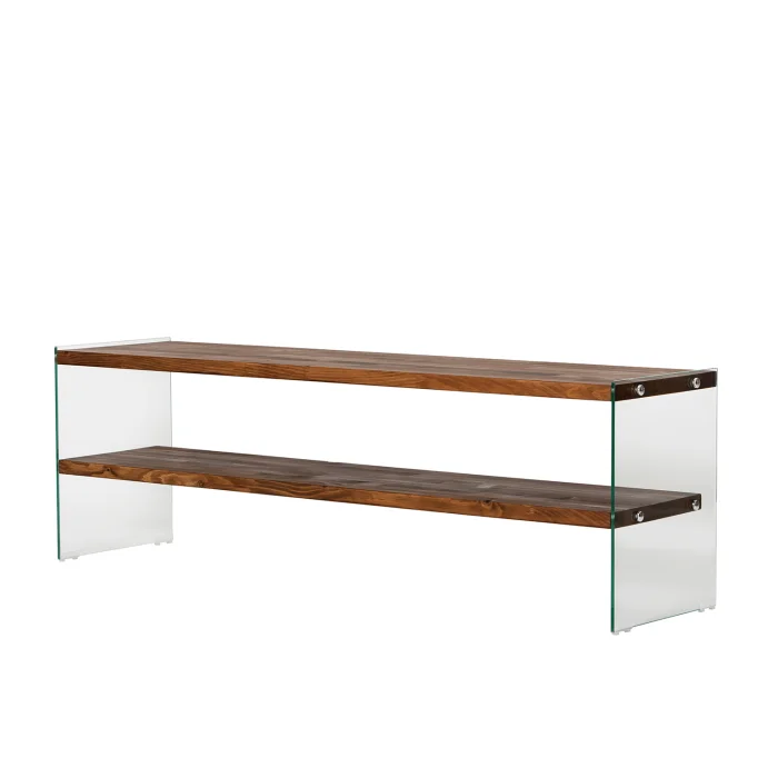 Transparent tempered glass is used on vertical surfaces and solid wood is used on horizontal surfaces. Wooden parts are colored by hand with a water-based wood protective.