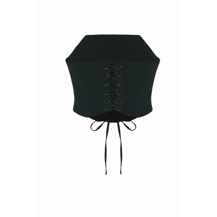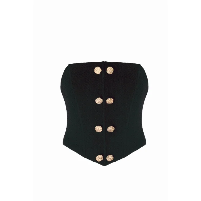 Medici corset, which draws attention with its underwire structure and gold button details, offers an elegant silhouette. Thanks to its adjustable back tie detail, it fits the body perfectly. • Underwire design •Gold button details • Back fastening feature 100% COTTON The model is 179 cm tall, has measurements of 82 cm chest, 60 cm waist and 89 cm hips. It has a size S on it. It offers an elegant silhouette with its underwire structure and gold button details. Thanks to the tie detail at the back, it fits the body perfectly. High waist trousers create an impressive look when combined with pencil skirts or shorts.