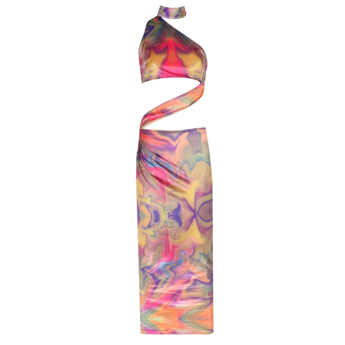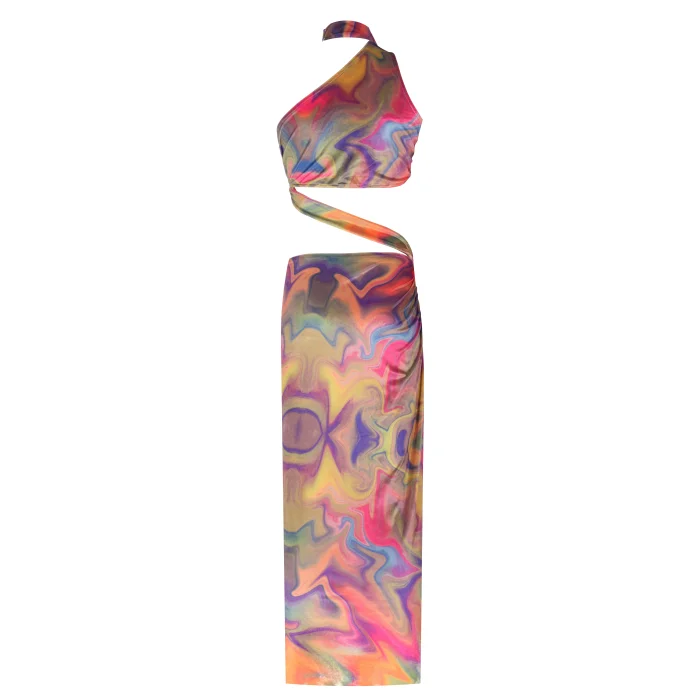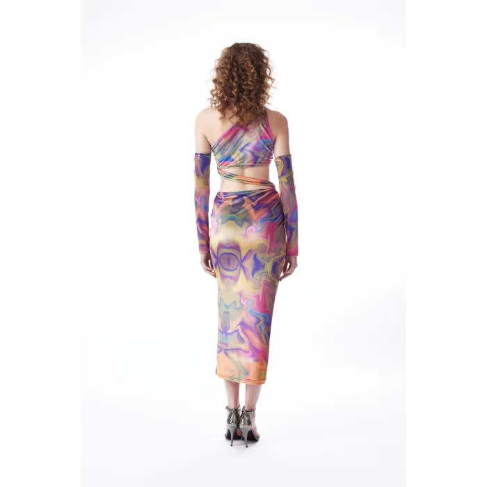 A bold and captivating design! This velvet dress fits seamlessly with the body with its gathered details, creating a modern and feminine silhouette. You can complement it with high heels to attract all the attention at special events. •Luxurious velvet textured fabric •Form-fitting fit with gathered details • Low-cut waist and asymmetrical cut • Stunning and modern design VELVET 91% POLY 9% EA All prints designed for no'design are original and exclusive to our brand. The model is 180 cm tall, has measurements of 82 cm chest, 60 cm waist and 89 cm hips. Size S was preferred on the model because it offers a perfect look with its body-fitting cut.