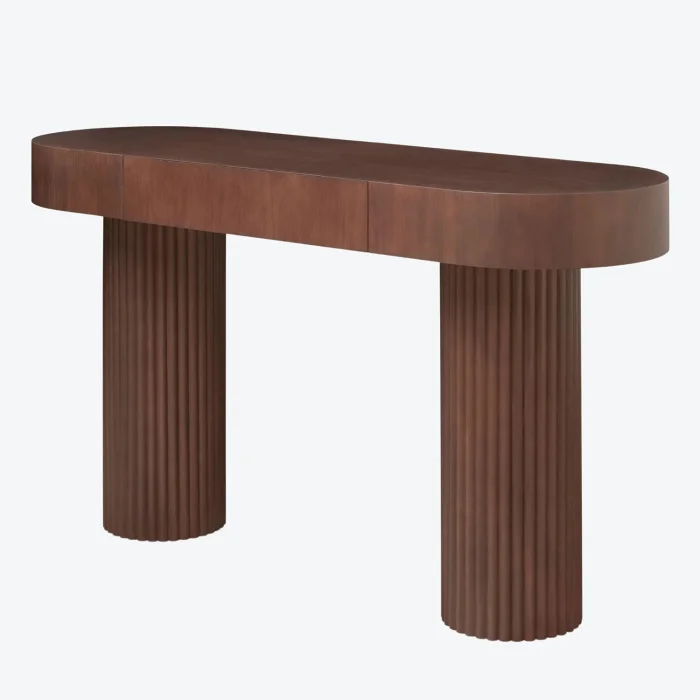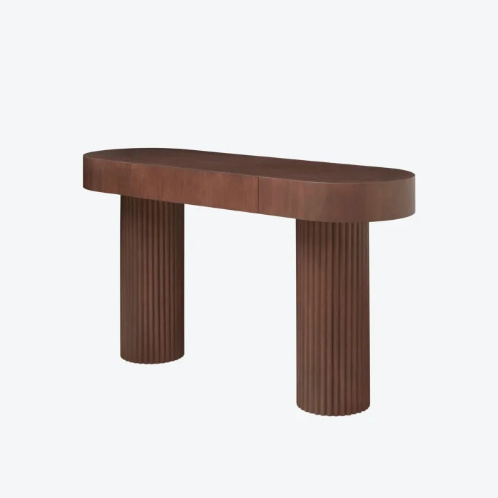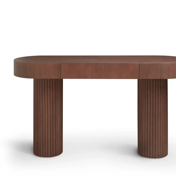The product table is made of natural walnut veneer material and has one drawer. Product foot columns are formed with individual slats and have a walnut lacquer color.