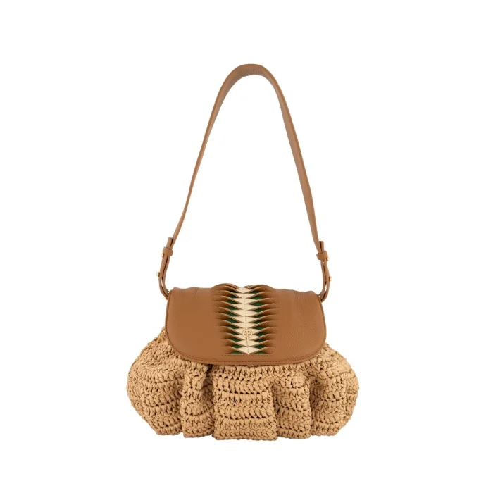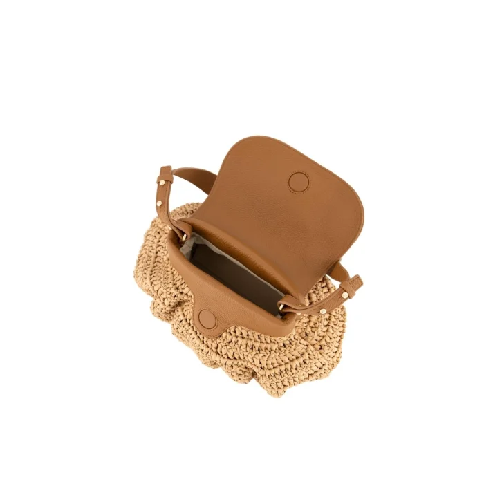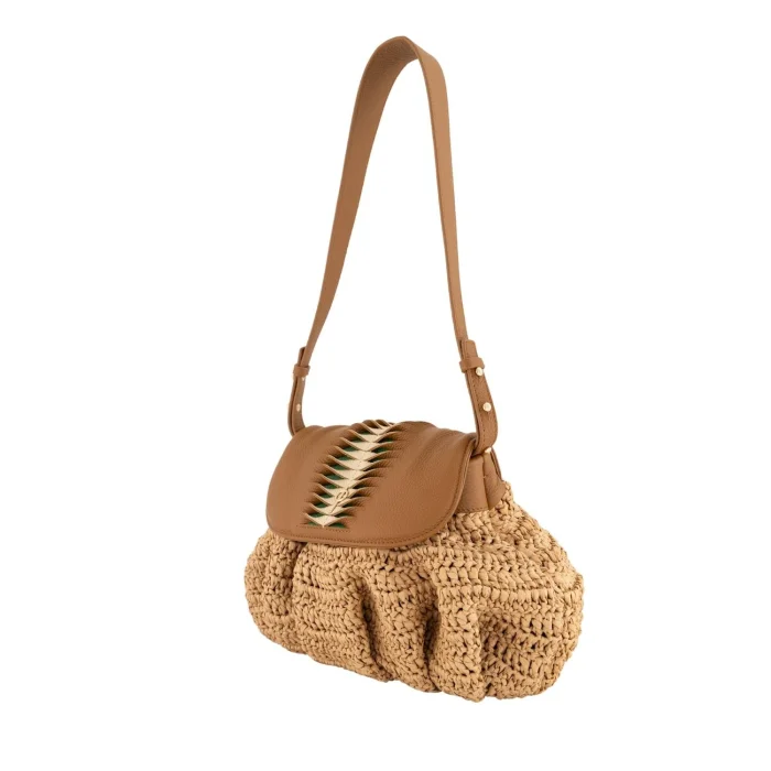 100% genuine leather, Raffia weave, Magnetic Clip, Shoulder Strap, Mobile Phone Compartment