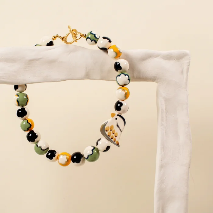 All pieces are made from air dry clay. All beads and patterns are hand made. The metals used in the clips are gold plated. Measurements are approximate and can slightly differ for each piece.