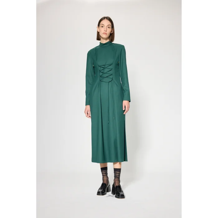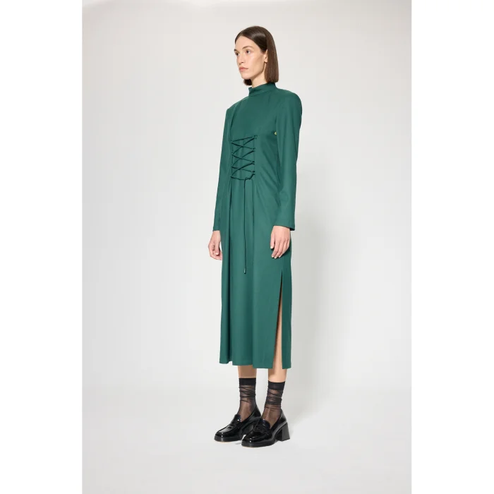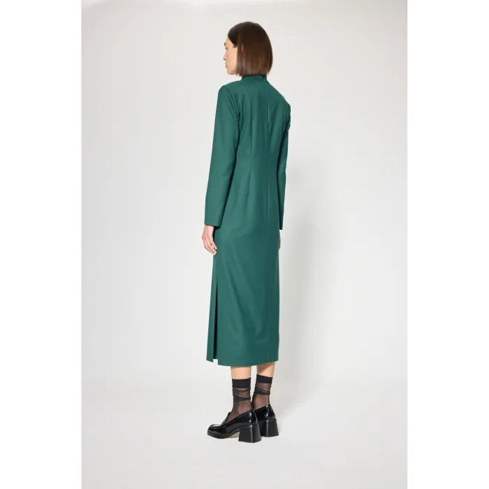 Fabric: Viscose blended flannel fabric Volume: Stand-up neckline, straight form, side slit Length: Maxi dress Detail: Adjustable strap at the front, zipper closure at the back, sleeve house contrast eyelet accessory detail