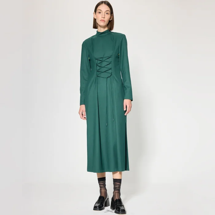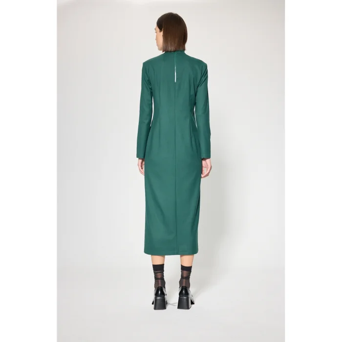 Fabric: Viscose blended flannel fabric Volume: Stand-up neckline, straight form, side slit Length: Maxi dress Detail: Adjustable strap at the front, zipper closure at the back, sleeve house contrast eyelet accessory detail