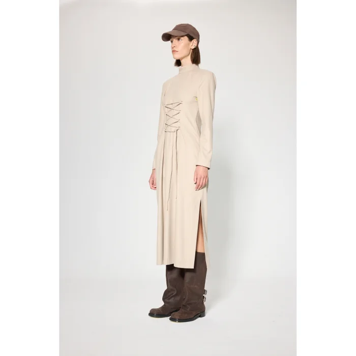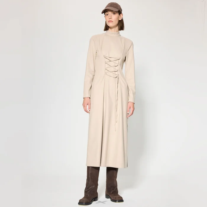 Fabric: Viscose blended flannel fabric Volume: Stand-up neckline, straight form, side slit Length: Maxi dress Detail: Adjustable strap at the front, zipper closure at the back, sleeve house contrast eyelet accessory detail