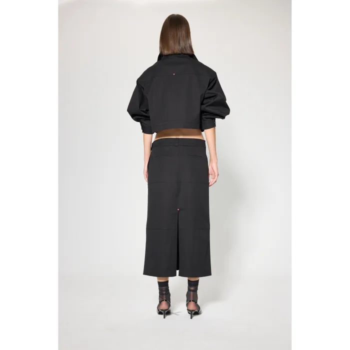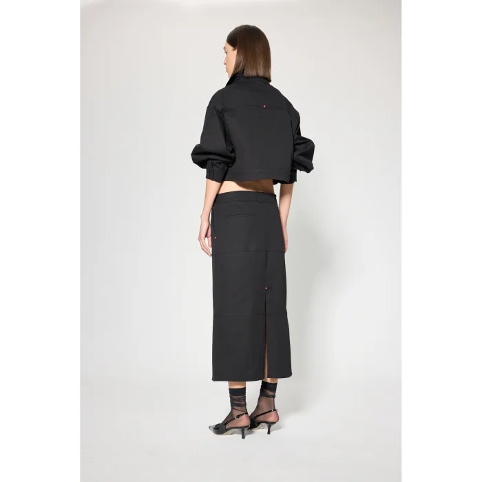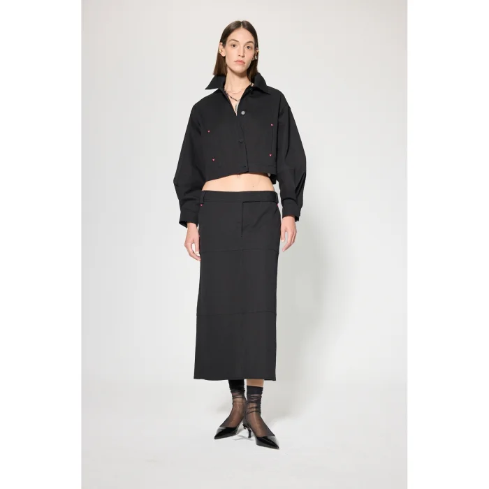 Fabric: Bi-stretch fabric Volume: Comfortable shape, low waist Length: Maxi skirt Detail: Zipper closure at the front, slit at the back, red rivet detail