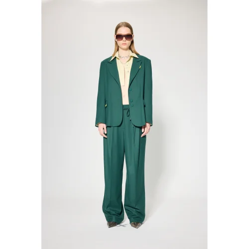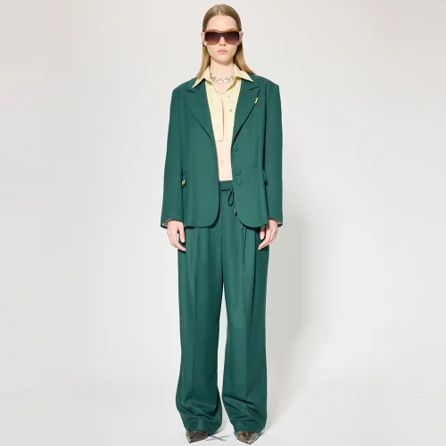 Fabric: Viscose blended flannel fabric Volume: Wide padded, mono closure oversize blazer Length: Hip speed Detail: Pocket flaps contrast eyelet accessory detailed