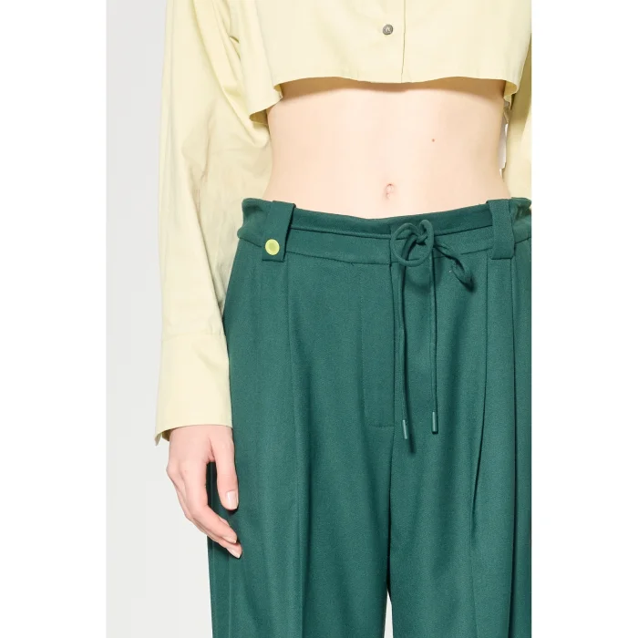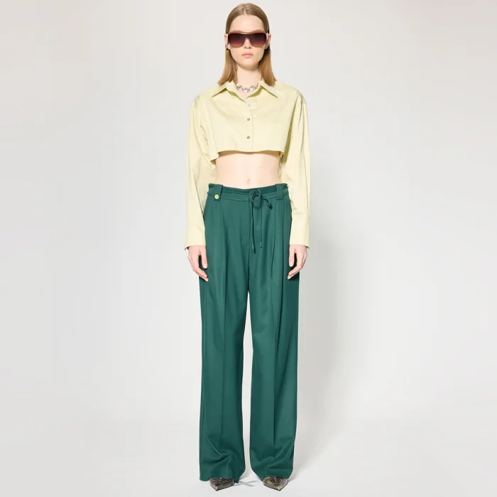 Fabric: Viscose blended flannel fabric Volume: Slightly low waist, two pleated, wide-leg trousers Length: Long leg Detail: Belt bridge with eyelet detail, waist adjustable with cord