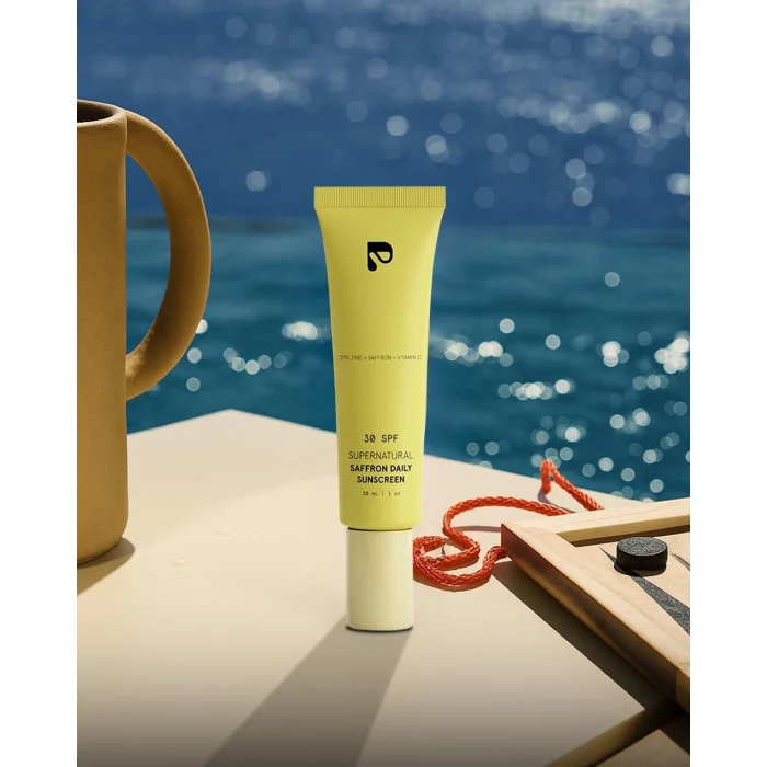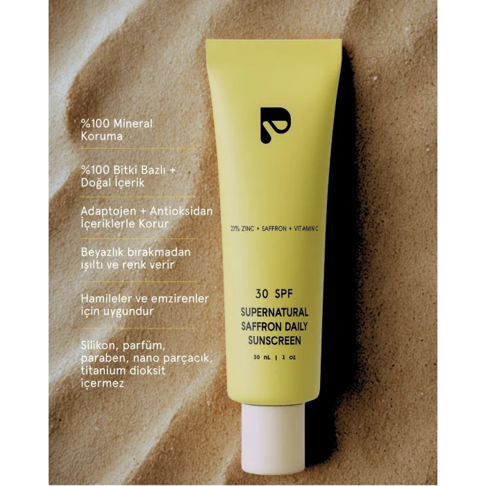 Supernatural Daily Saffron Sunscreen is not only powered by physical filters, but also by saffron extract , one of the most powerful antioxidants nature has to offer. While protecting the skin against harmful UVA and UVB rays with a reflective barrier, it reduces oxidative stress thanks to the rich carotenoid structure of saffron and strengthens the skin's defense mechanism against cellular damage. Pelcare's special Saffron and vitamin C composition provides 5 different antioxidant-rich adaptogen to protect the skin against blue light, environmental stressors and free radicals and zinc oxide .