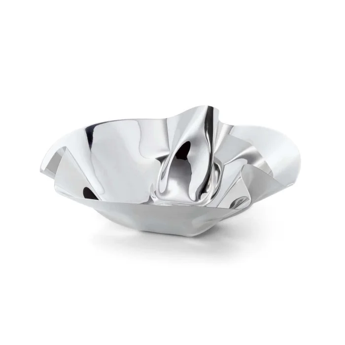 Mango, Kiwi, Lychee and Pitaya - The fruit world comes together in Margarethe muscle. Its silver-colored, shiny face alone promises an enticing delicious beauty; Its contents complement this sweet culinary delight. Smoothly inclined folds are shaped by hand - so each muscle is a special original. This description presents a depiction of various fruits coming together inside a bowl called Margarethe. It is stated that the bowl has a silver color and shiny appearance, and it is stated that the fruits presented in it complete this sweet feast of flavor. It is emphasized that the soft beveled folds of the bowl are shaped by hand, and therefore each bowl is a special original.