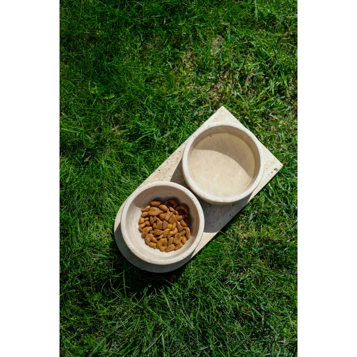 Its material is light travertine. Plate Dimensions: 35cm x 17cm x 2cm ; Bowl: 16cm x 16cm x 7cm