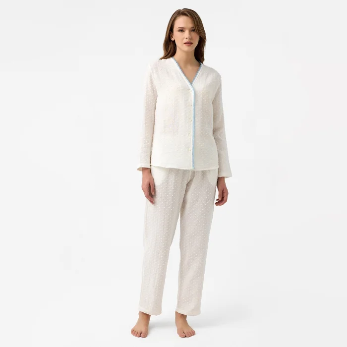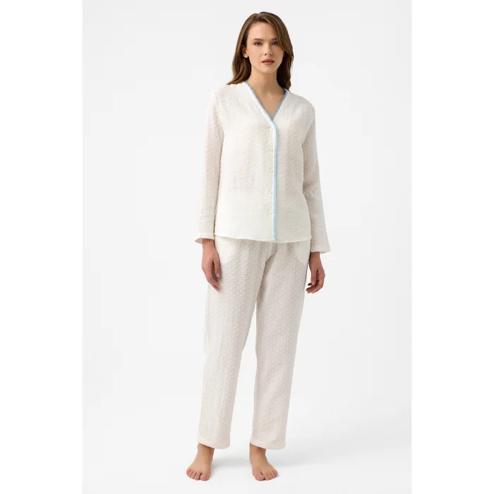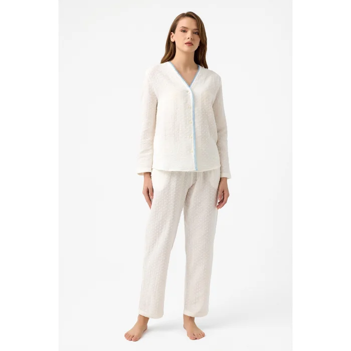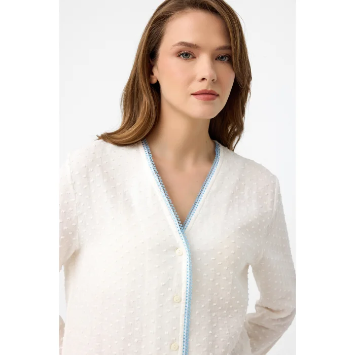100% cotton double-layer muslin fabric Lara pajama set.  It has a tiny white pompom, the blue lace detail on the collar offers a stylish look. It provides comfortable use with its soft texture.  The trousers have pockets and can be adjusted to your waist thanks to the belt. The front buttoned top provides ease of use for breastfeeding women.
