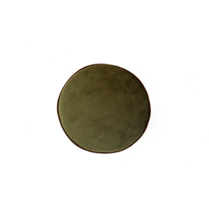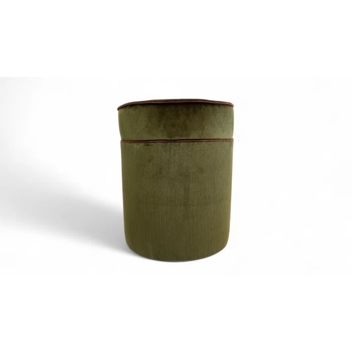 The round pouf conveys both a retro and modern vibe with its green striped velvet fabric. The pinstripe texture on the body adds depth, while the flat and soft upper surface offers comfort. The brown piping detail that wraps around the top and bottom edges gives the design a sophisticated frame and enhances the visual appeal thanks to the contrast.