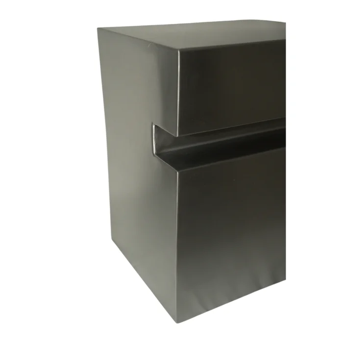 This modern metal side table combines industrial aesthetics with minimalism, showcasing a strong and sculptural presence through its clean geometric form and sharp lines. The high-quality metal surface features a brushed matte texture, offering both elegance and durability. The horizontal cut-out detail at the top adds visual interest and enhances its architectural character.