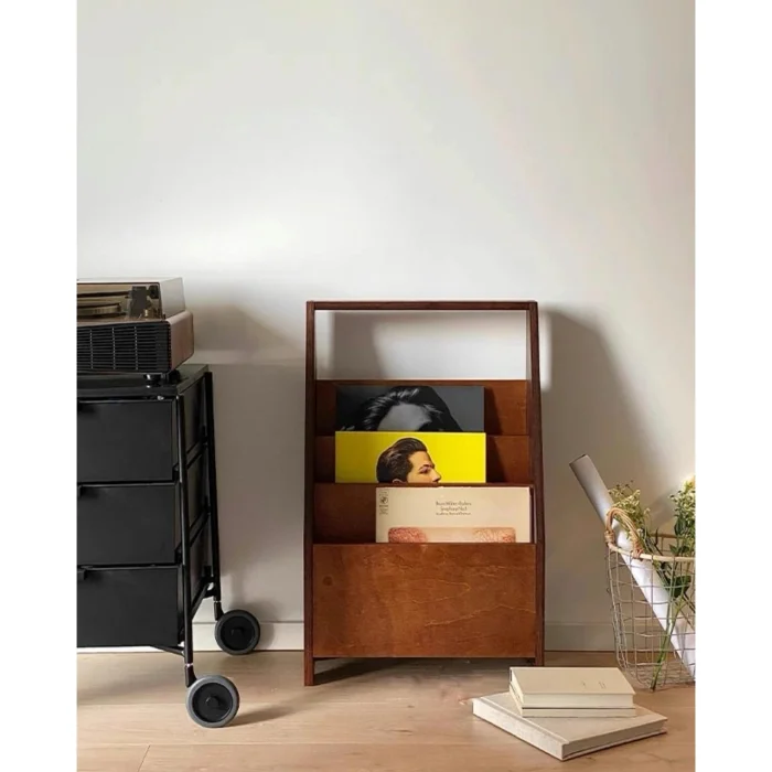 The retro wooden bookcase, with its simple form and sloping stance, offers both an organizer and a decorative solution for books, magazines and records. Thanks to its open compartment structure, it makes book and record covers visible and highlights the selected pieces.