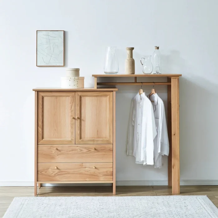 The large double-door cabinet and two deep drawers on the left keep your clothes, daily items and textile products neatly stored; The open hanging area on the right creates a practical solution for shirts, jackets or pieces that need to be hanged in daily use.