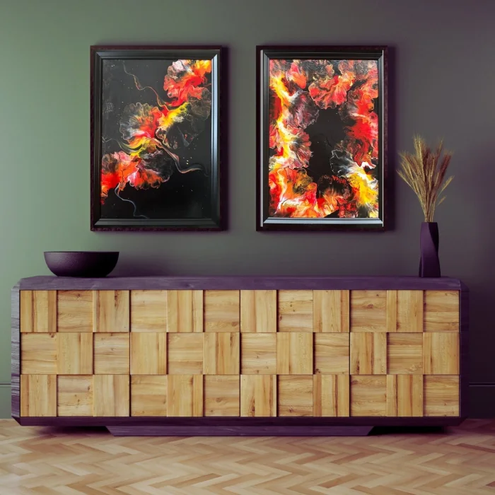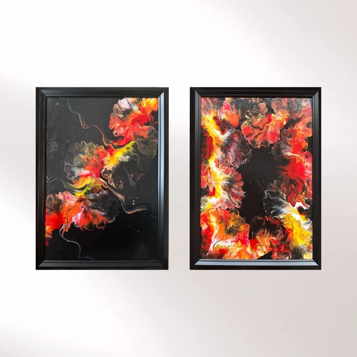 Acrylic pouring technique was applied on the canvas and glossy varnish was used for its surface.