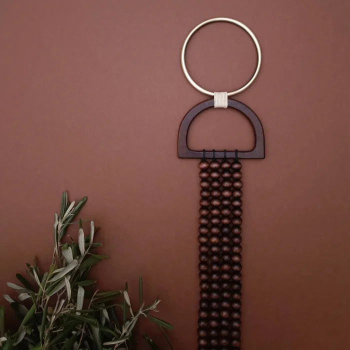 The Aria was designed with an aged gold circle and brown wood in the shape of a half moon, then decorated with bead columns. You can combine it with pleasure in entrances, living rooms, verandas and balconies. Each product is handmade, so sizes and colors may vary slightly.