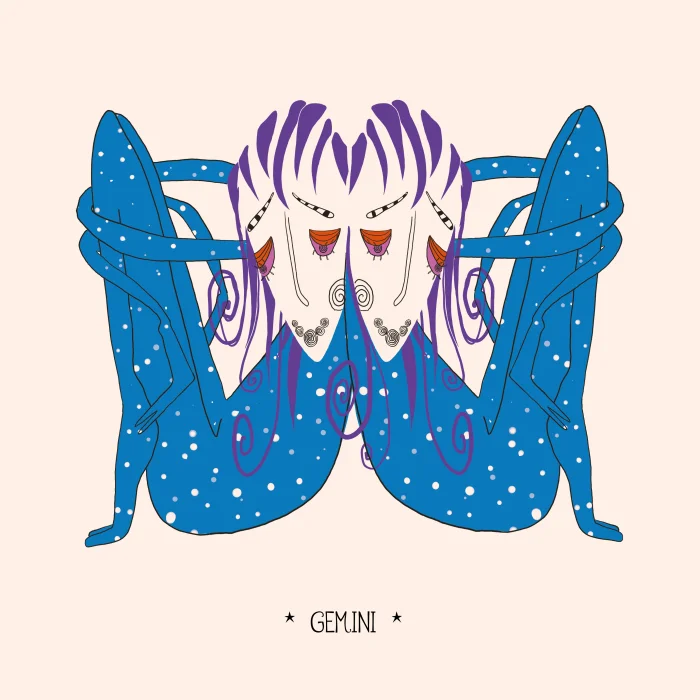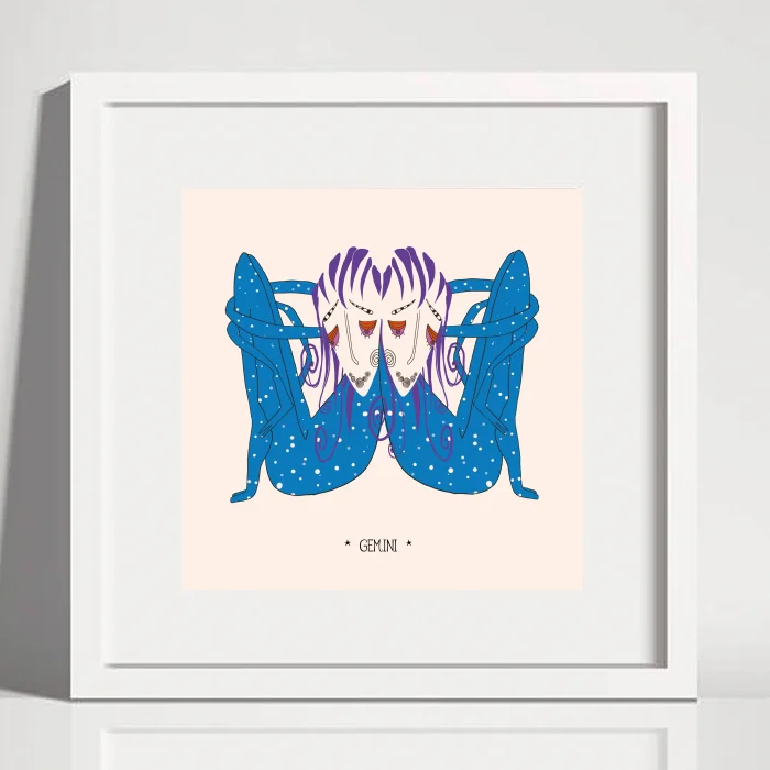 Gemini Astrology Themed Illustration Fine Art Print The work was digitally drawn by artist E.Büşra Tekin on behalf of the QUFF brand. Type: Illustration / Modern Wall Decor Printing: Fine Art Size: frameless size 20×20 cm. The width of the mount is 2 cm. Material: High quality printing paper. Colors: Printed with vivid and durable inks. The work will be signed and sent by the artist. The color of the frame is white, the thickness is 1 cm. Uses: Home décor Office decoration Restaurant or café decoration Gift purposes
